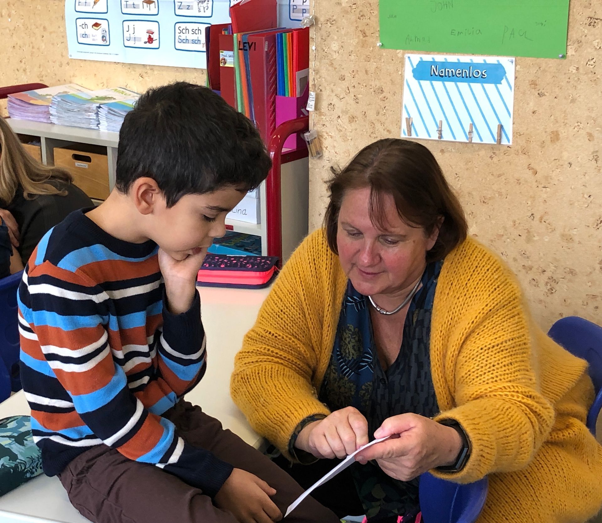 Die Erstklässler durften schließlich noch zeigen, wie weit sie bereits beim Lesen lernen gekommen sind. Die Schülerinnen und Schüler bekamen von ihrer Klassenlehrerin Carina Seebach unterschiedlich umfangreiche Leseteppiche, die sie zunächst alleine für sich erlasen. Unsere Gäste setzten sich dann einzeln zu den Kindern und ließen sich von ihnen vorlesen bzw. lasen mit ihnen gemeinsam. Sicherlich ein unvergessliches Ereignis.