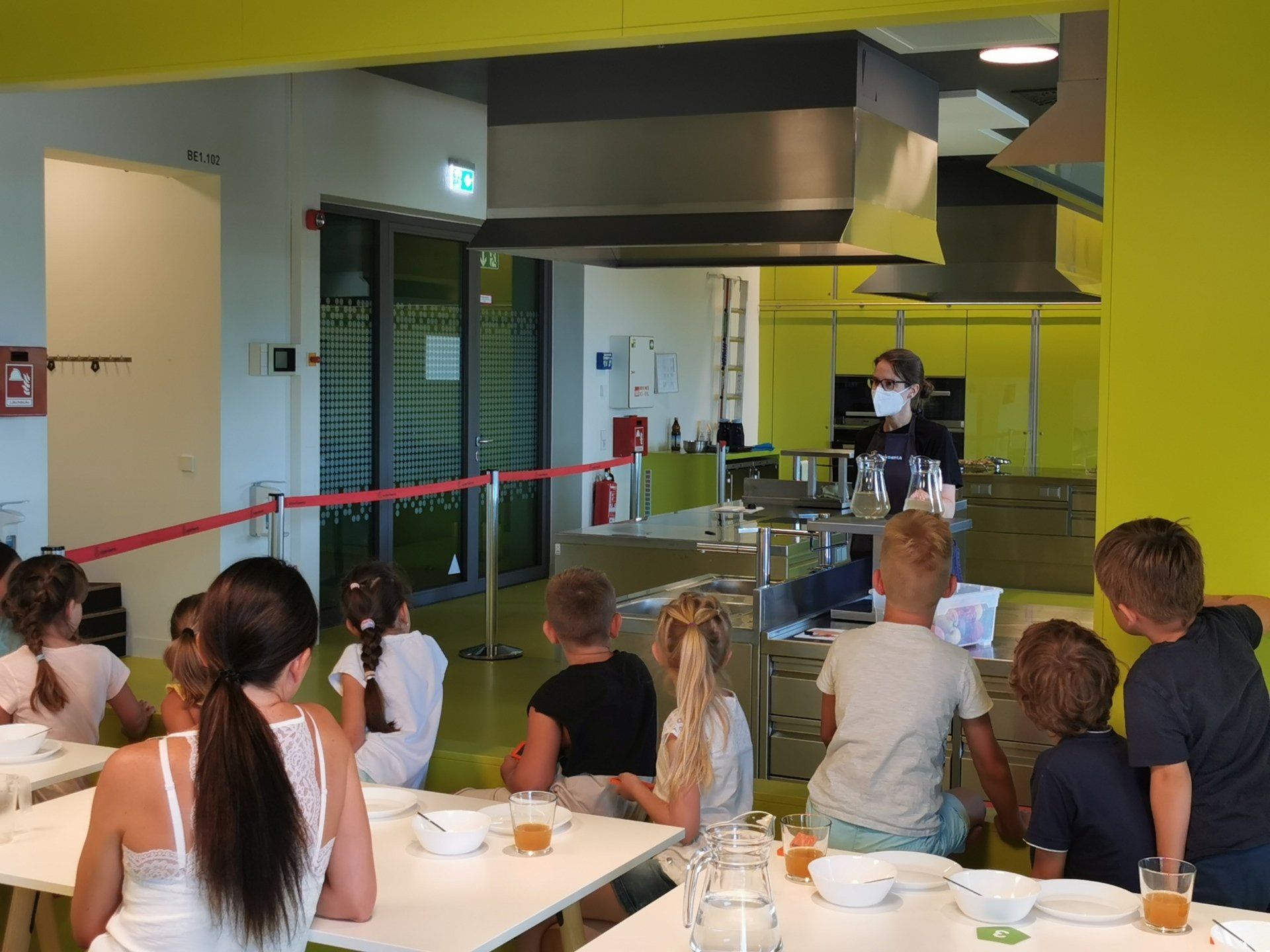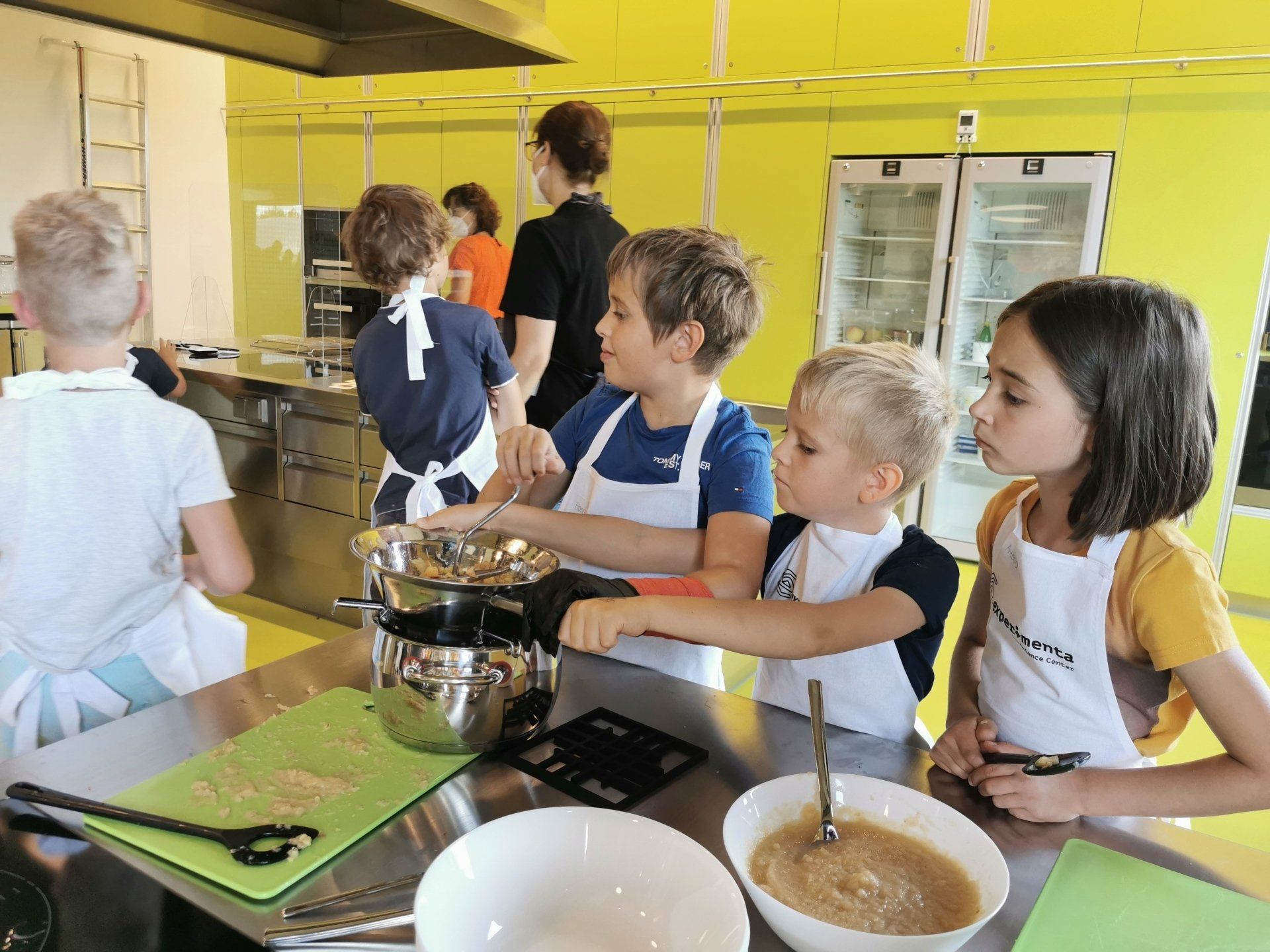 Am Donnerstag, den 14. Juli 2022 machte die Klasse 2b einen Ausflug nach Heilbronn zur Experimenta. Wir trafen uns morgens direkt am Bahnhof in Bitzfeld und fuhren gemeinsam mit der S-Bahn nach Heilbronn. Vor der Experimenta erwartete uns auch schon eine Mitarbeiterin, die uns in die Experimentier-Küche führte. In der Küche waren bereits verschiedene Stationen rund um das Thema Apfel aufgebaut. Zunächst durften die Schülerinnen und Schüler verschiedene Apfelsorten probieren, beschreiben und ihre Lieblingssorte auswählen. In Gruppen konnten die Kinder dann Apfelsaft pressen, Apfeltaler backen und Apfelmus selbst herstellen. Das Durchdrehen der weichen Äpfel durch die "Flotte Lotte" brauchte ganz schön viel Kraft. Außerdem konnte man sich den Apfel unter einem Mikroskop ganz genau ansehen.